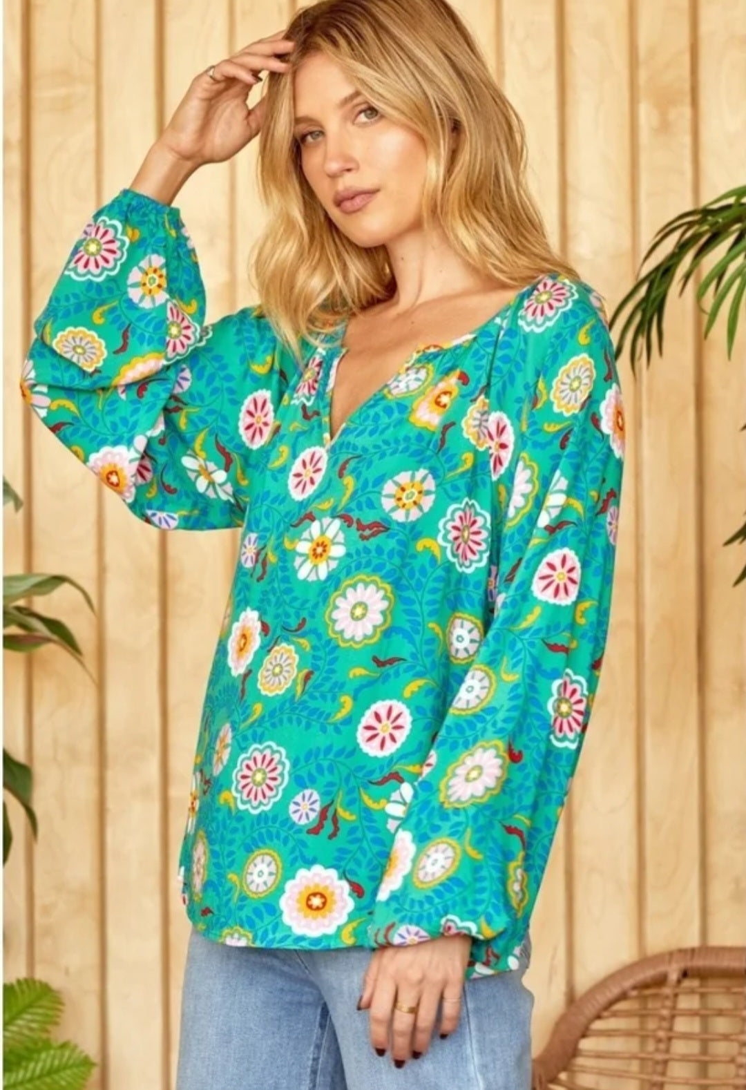 SASSY Floral is the Abigail! Peasant Top Loose Fit in Woven Fabric with Bubble Sleeves. S(2/4), M(6/8), L(10/12), 1X(14/16), 2X(18/20), 3X(22)
