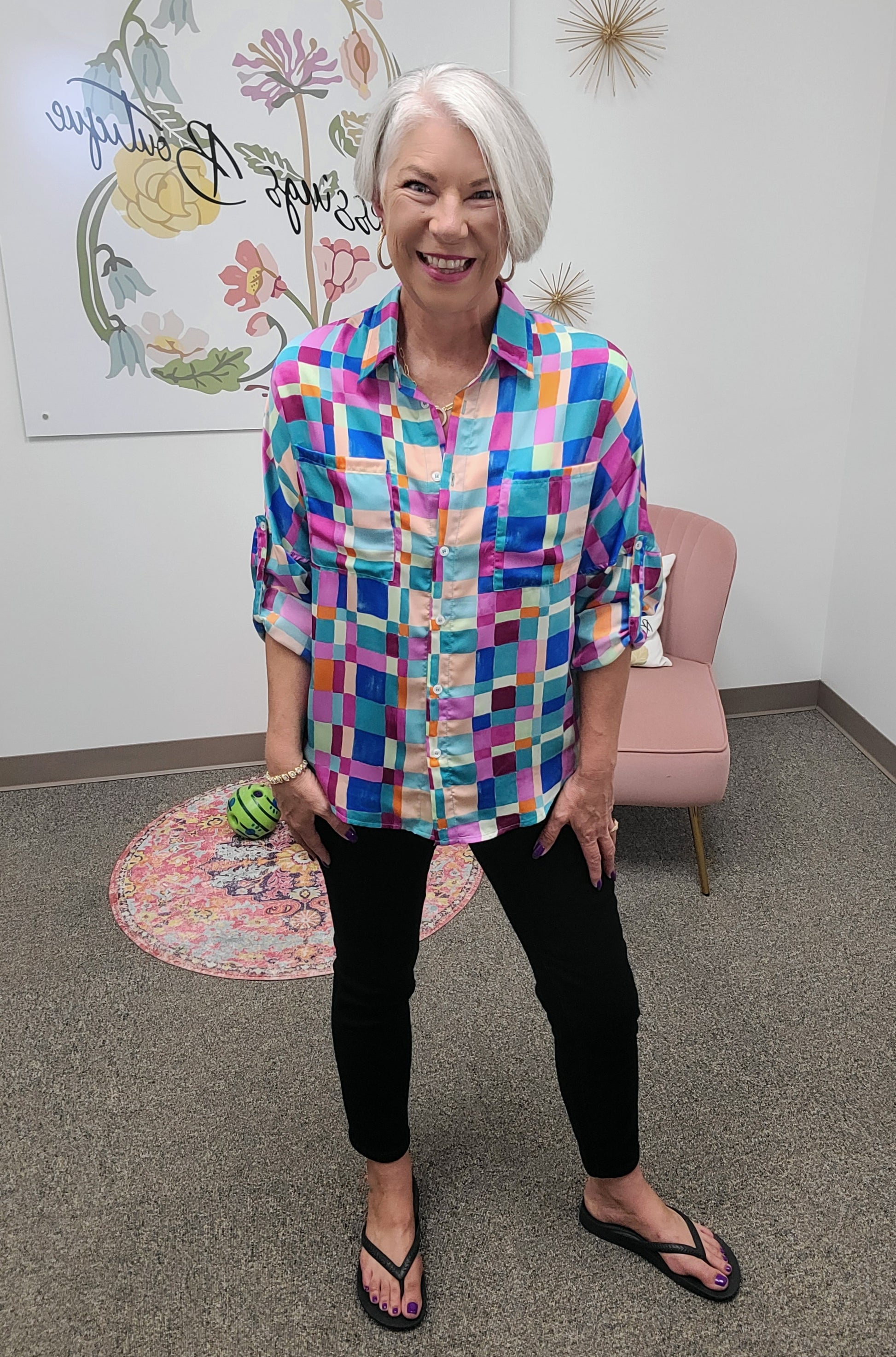 Introducing the Emerson Collared Blouse in Multi Check. This vibrant blouse features a colorful check pattern and a classic collared design. With roll tab sleeves and a flowy fit, this blouse is perfect for any occasion. Upgrade your wardrobe with this must-have piece from Emily Wonder.