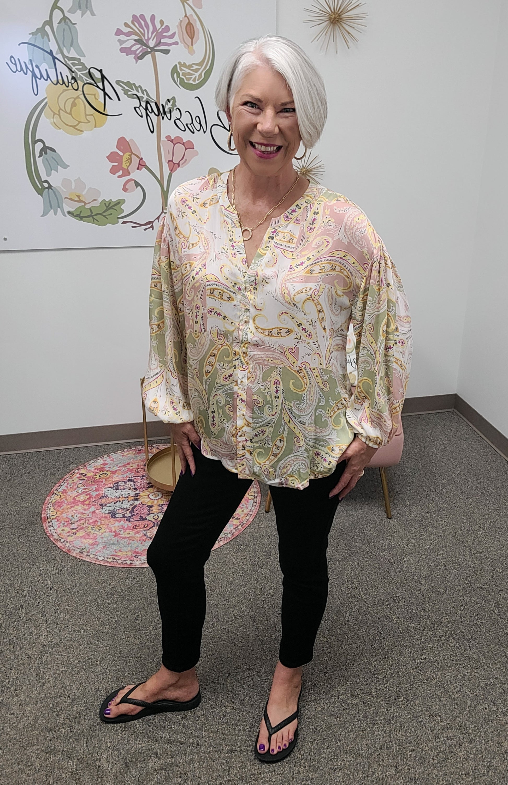 Introducing the Elizabeth Button Blouse, a must-have for any sophisticated wardrobe. With its professional and loose fit, this blouse exudes elegance and style. The soft pastel paisley design adds a touch of femininity, while the roomy fit offers comfort and versatility. Elevate your look with this exclusive blouse.