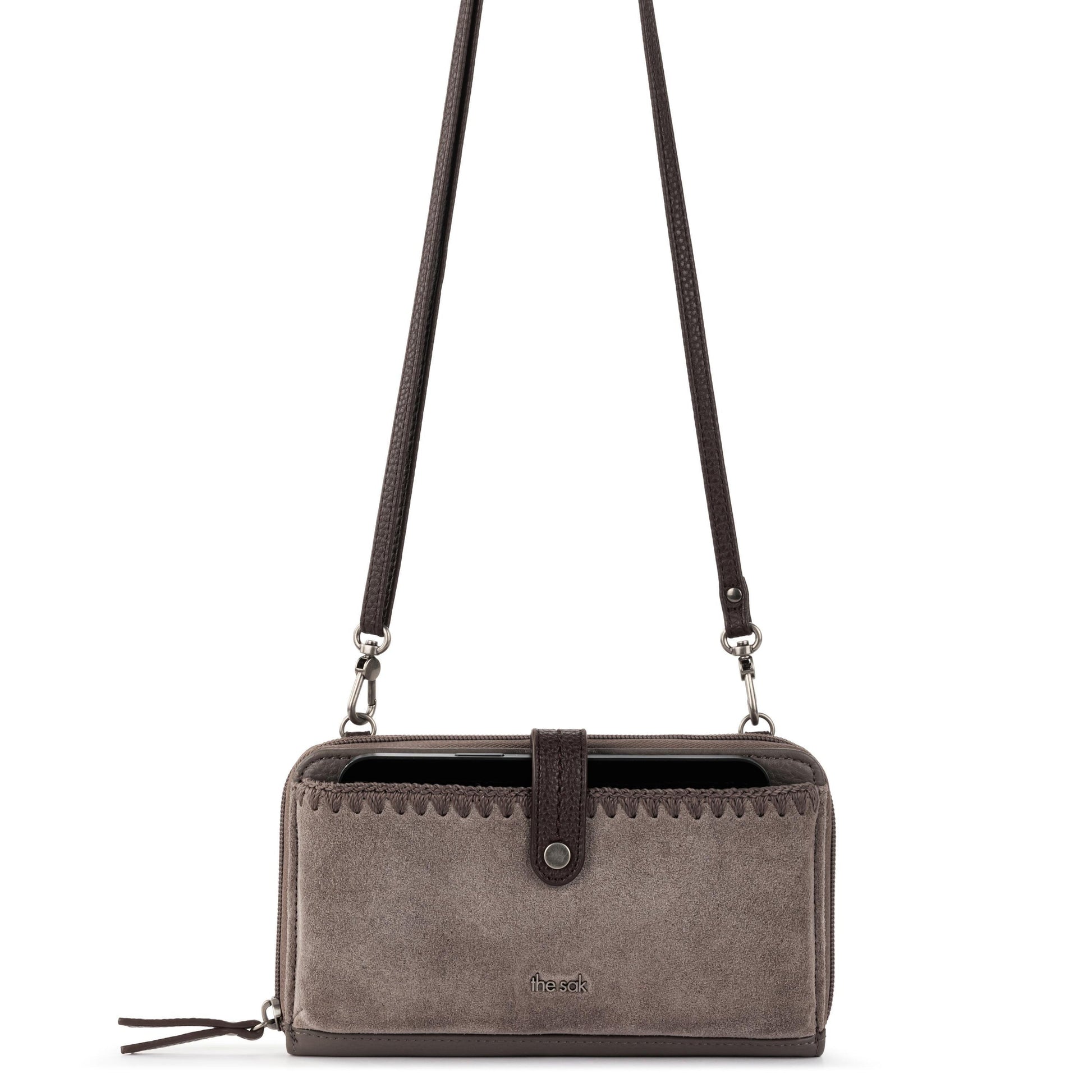 - Front phone pocket with snap closure